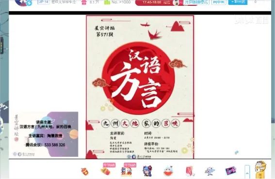 结合“春节”主题,星空讲坛邀请到了复旦大学中文系教授陶寰老师,与大家分享了主题为“汉语方言:九州大地,家的召唤”的讲座,两百余名同学通过腾讯会议参与讲坛活动,领略了汉语方言与民俗的魅力,讲座也同步于B站直播,受到B站同学的关注与称赞。