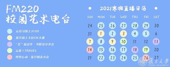 “艺起过年——FM.220寒假特别直播”系列活动充实你的新春假期。本次系列活动包括四个部分。“云自习之线上3109”直播界面模拟复旦教室场景,让大家居家学习也像在学校一样高效,陪伴同学们的居家学习时光。目前云自习直播17小时。“书影音分享会”包含“开卷十分钟”阅读分享、“荧幕白日梦”电影推荐、“降噪220”音乐欣赏、“非正式谈艺”艺术讨论四个板块,通过分享书影音和艺术相关话题,为同学们假期的文化娱乐生活提供参考与启发。“云游I travel”通过vlog展现全国各地的美食与美景,在品尝特色美食、观看春节街景的过程中,体现各地过节习俗、氛围与特色。“怦然心动——复旦相亲小会”以声音交流为主要互动形式,旨在为同学们提供相识相知的契机,在校园中发现更多有趣的灵魂,借着情人节的好彩头,开启一段“怦然心动”的故事。