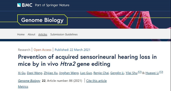 近日,生物医学领域的著名期刊Genome Biology在线发表了复旦大学附属眼耳鼻喉科医院教授李华伟和研究员、副主任医师舒易来团队题为“Prevention of acquired sensorineural hearing loss in mice by in vivo Htra2 gene editing”(Htra2基因编辑预防获得性感音神经性聋)的论文。该研究以Htra2基因为靶点,构建了两种敲除Htra2基因的CRISPR/Cas9基因编辑系统(SpCas9和SaCas9系统),然后利用新型腺相关病毒(AAV)Anc80L65将其运载至小鼠动物模型内耳,实现了活体对Htra2基因的编辑,明显提升了氨基糖甙类抗生素暴露后小鼠耳蜗毛细胞的存活,并显著改善了听觉功能。这是国际上首个利用CRISPR/Cas9基因编辑技术防治获得性非遗传性感音神经性聋成功的研究,为感音神经性聋防治的重要进展。