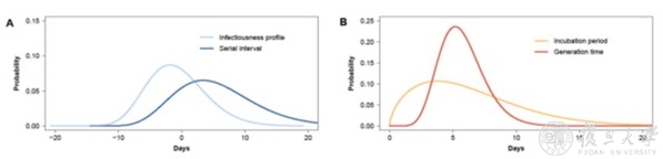 图1:新冠肺炎的流行病学参数,A:传染期和系列间隔;B:潜伏期和代际间隔。