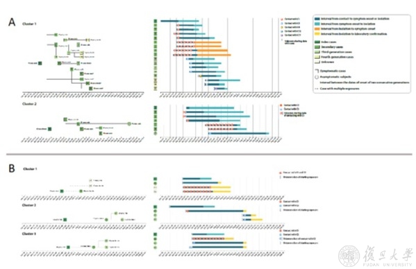 图2:湖南省存在症状前传播或无症状传播的新冠肺炎聚集性疫情传播链,A:症状前传播;B:无症状传播。
