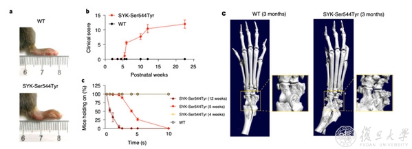 李大力教授是CRISPR/Cas9基因编辑技术的权威专家,是最先利用Cas9技术构建基因修饰大鼠和小鼠的研究者之一,复旦儿科黄瑛教授与李大力教授团队合作,通过CRISPR/Cas9基因编辑技术在五周左右的时间便成功地构建了模拟病人突变的小鼠模型,发现SYK突变小鼠能产生自发性关节炎表型,病变组织分析亦发现Syk自身磷酸化水平增加,突变小鼠体内破骨细胞产生多且存在免疫细胞比例失衡;采用Syk小分子抑制剂干预或移植野生型小鼠骨髓,可减轻突变小鼠的关节病变损坏程度。李大力教授介绍:“据我们所知,这是目前国际上第一个模拟人类突变能导致小鼠产生自发关节炎的模型,对于关节炎发生的机制和后期药物研发有重要意义。”