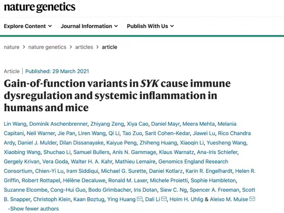 3月29日,国家儿童医学中心、复旦大学附属儿科医院消化科主任黄瑛教授团队在国际权威杂志《自然-遗传学》(Nature Genetics)以论著形式在线发表了题为“Gain-of-function variants in SYK cause immune dysregulation and systemic inflammation in humans and mice”的论文。本研究在国际上首次报道导致慢性肠炎、关节炎、皮肤炎症等多系统自身炎症免疫性疾病的一种新型致病基因SYK,开拓了极早发型炎症性肠病研究的新领域。