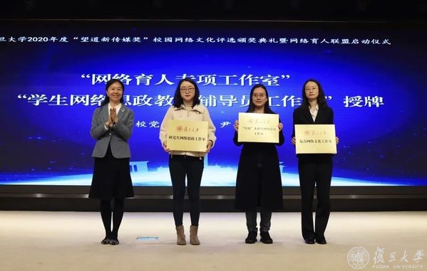 “老师们、同学们,我们的活动即将开始,请尽快就座,并将手机调至震动或静音,谢谢!” 3月30日下午,复旦大学2020年度“望道新传媒奖”校园网络文化评选颁奖典礼暨网络育人联盟启动仪式在一位“特别”的司仪、机器人助理辅导员小云的引导下开启。校党委副书记尹冬梅出席典礼并讲话,学校宣传、学生工作部门负责人参加典礼并为获奖单位和个人颁奖。