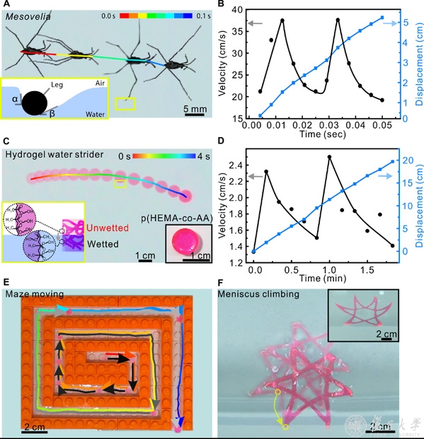 研究团队探索发现其运动机理和自然界的水黾在水面的运动存在共通之处,都通过表面张力的差异驱动自身在水面运动(如图1A和1C所示),并且运动速率的变化规律也非常一致(如图1B和1D所示)。通过设计活性水凝胶材料的形状、材料分布的非对称性和周边环境的表面亲疏水性,研究团队控制该活性水凝胶材料进行各种可控轨迹和定向的运动,例如模拟球类运动和走出迷宫运动(图1E)等。