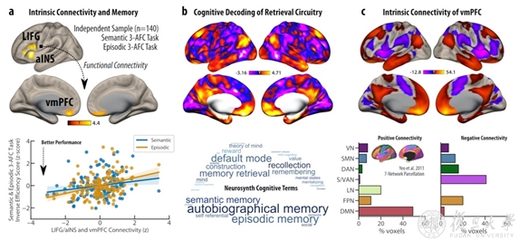 研究团队设计了两组相互独立的实验。第一组实验使用功能性磁共振成像技术,发现大脑在提取语义记忆和情景记忆时,一部分共同脑区的激活程度增强。研究结果显示,左侧额下回(left inferior frontal gyrus, LIFG)、前岛叶皮层(anterior insular cortex, aINS)都参与了弱关联的语义和弱编码的情景记忆的提取。第二组大规模的个体差异性实验进一步发现了一个共用的脑区环路,其中左侧额下回和前岛叶皮层与作为默认网络的核心区域腹内侧前额叶皮层(ventromedial prefrontal cortex,vmPFC)的功能连接减弱与两种记忆提取的更好表现有关。这两组实验结果揭示了辅助语义记忆和情景记忆提取的共有神经环路,从而使得大脑能够灵活地提取功能不同的长时记忆。