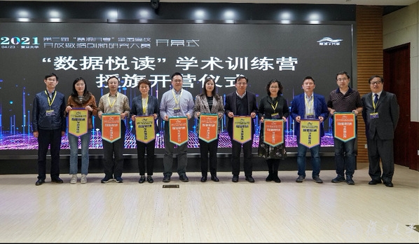 复旦大学资深教授、图书馆馆长陈思和,上海市经信委信息化推进处副处长山栋明,上海市教委信息中心主任王明政,上海市高校图工委常务副秘书长潘卫分别在开幕式上致辞,并与安徽大学图书馆馆长储节旺、南京大学图书馆JALIS管理中心办公室主任赵华、山东大学图书馆副馆长程蓓、浙江理工大学图书馆副馆长刘翔、上海外国语大学国际金融贸易学院院长章玉贵一同启动大赛。上海市教委信息中心总工朱宇红进行赛事回顾及系列活动介绍。数据大赛系列活动“数据悦读”学术训练营在开幕式现场举行开营仪式,北京万方数据股份有限公司副总乔晓东、上海阿法迪智能数字科技股份有限公司董事长兼CEO张良元为训练营各站代表授旗。