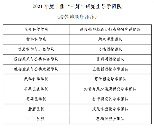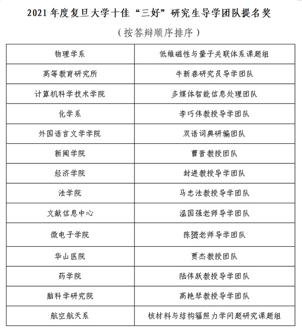 十佳“三好”研究生导学团队展评活动是复旦大学推动研究生导学关系建设的重要举措之一。通过评选、挖掘和展示“学术研究好”、“人才培养好”和“文化建设好”的研究生“三好”导学团队,助力构建导学关系融洽、朋辈氛围良好、安全制度健全、学术学风严谨、生涯引导有效、双创活动踊跃的全方位发展格局,充分发挥导学团队的育人功能。