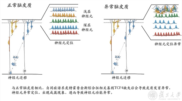 皮质的神经元由位于脑室区的神经干细胞发育而来,这些神经元会迁移到皮质特定位置。尽管目前对神经元迁移机制有了一定的了解,但对于神经元迁移到特定位置后是如何维持的尚不清楚。解云礼团队通过构建转基因小鼠动物模型,结合细胞生物学、免疫组织化学染色、脑片培养及成像技术和光遗传技术等,发现自闭症谱系的皮特霍普金斯综合征相关基因TCF4通过调控神经元粘附分子的表达进而调控神经元在皮质中的精确定位。皮特霍普金斯综合征是一种单基因突变导致的罕见病,主要表现为发育迟缓、智力障碍和语言障碍。然而,目前对该疾病的发病机制尚不清楚。研究发现,当皮质神经元中缺失TCF4后,小鼠皮质的上层神经元出现成簇现象,进而导致神经元功能异常。值得一提的是,神经元成簇现象与文献报道自闭症患者脑中存在的神经元异常病理结构非常类似。因此,该研究为了解皮特霍普金斯综合征和自闭症的发病机制提供了新的理论依据。