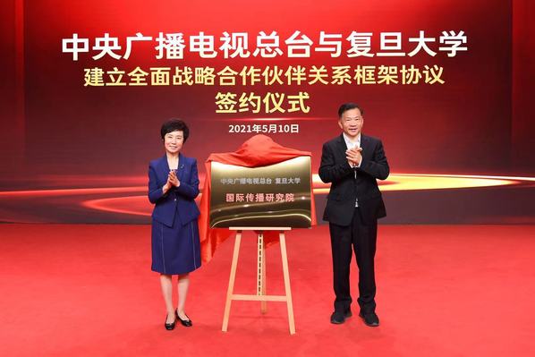 5月10日,中央广播电视总台与复旦大学签订全面战略合作伙伴关系框架协议仪式在北京举行。中宣部副部长、中央广播电视总台台长兼总编辑慎海雄,复旦大学党委书记焦扬出席签约仪式并致辞。中央广播电视总台编务会议成员黄传芳和复旦大学党委副书记许征代表双方签约。慎海雄和焦扬共同为中央广播电视总台—复旦大学国际传播研究院揭牌。
