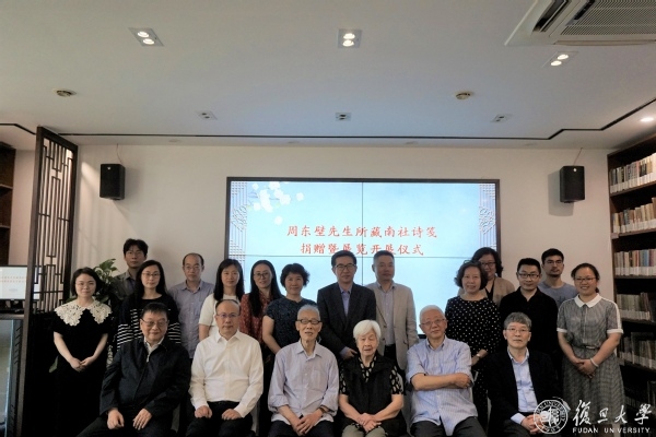 5月10日上午,捐赠暨展览开幕仪式在复旦大学文科图书馆卿云书房举行。复旦大学副校长陈志敏,捐赠人周东壁及夫人唐少奇,研究专家袁进、段怀清,南社社友后裔郑有慧、陈颖,复旦大学图书馆资深古籍专家吴格,复旦大学图书馆馆长陈思和、党委书记侯力强等出席了活动。