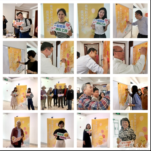 当天中午,在邯郸校区综合楼一楼大厅,贴着爱心与笑脸的解压益智小礼物整齐排列,机关职工纷纷放缓脚步,舒展笑颜加入“微笑倡议”,手持“微笑挂在脸上,服务记在心里”等金句板,在相纸上留下灿烂笑靥,将最美的语言无限传递。