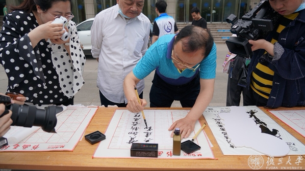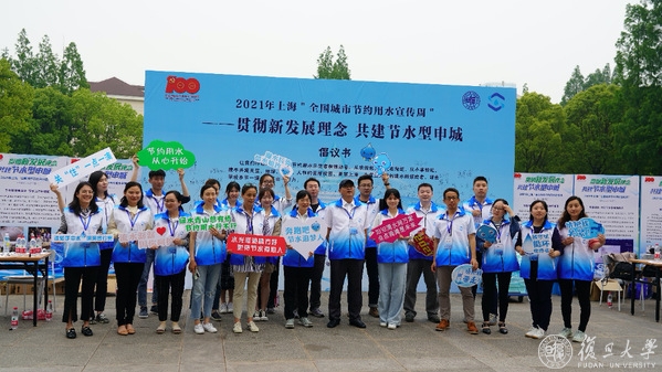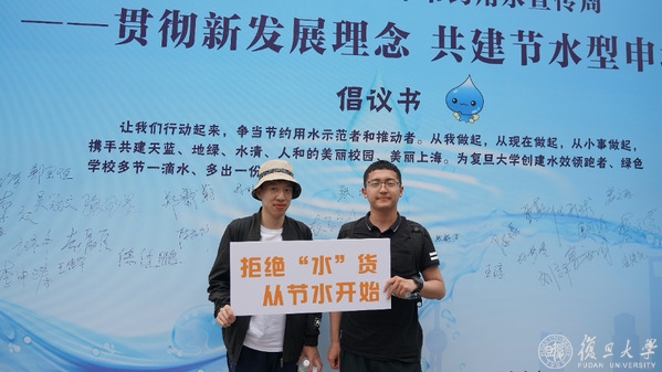 在“贯彻新发展理念,共建节水型申城”的主题背景板下,大家纷纷签名并响应节水倡议:从我做起,从现在做起,从小事做起,携手共建天蓝、地绿、水清、人和的美丽校园、美丽上海,为复旦大学创建水效领跑者、绿色学校多节一滴水、多出一份力。