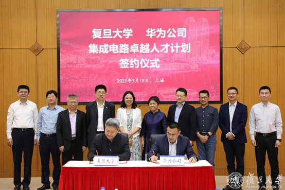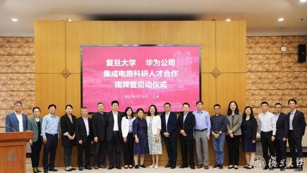 5月18日下午,复旦-华为集成电路科研人才合作揭牌暨启动仪式在复旦大学逸夫科技楼举行。复旦大学党委副书记许征、副校长徐雷,华为公司人力资源部副总裁曾凡丽、上海研究所所长董庆阳、全球技术合作副总裁艾超,复旦大学相关部门、院系代表,华为公司各部门代表出席会议。