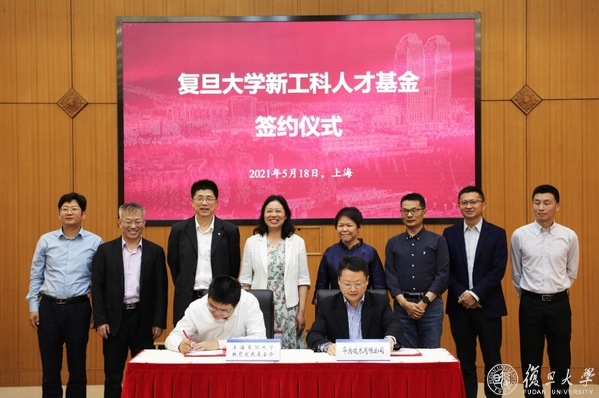 会上,华为上海研究所高校系统部部长左峻疆、复旦大学人事处副处长王光临介绍了复旦大学新工科人才基金、复旦-华为集成电路卓越人才计划、复旦大学兼职教授和行业导师以及复旦-华为微电子联合实验室概况。复旦大学对外联络与发展处处长、上海复旦大学教育发展基金会秘书长杨增国、华为全球技术合作副总裁艾超代表双方签约复旦大学新工科人才基金协议;复旦大学研究生院常务副院长陈焱、华为人力资源部招聘调配副部长黄建彬代表双方签约复旦-华为集成电路卓越人才计划。许征、徐雷、曾凡丽、董庆阳、艾超、复旦大学微电子学院院长张卫、复旦大学芯片与系统前沿技术研究院副院长刘琦、华为海思技术规划部部长王志敏、华为海思上研分部部长孙全共同见证。