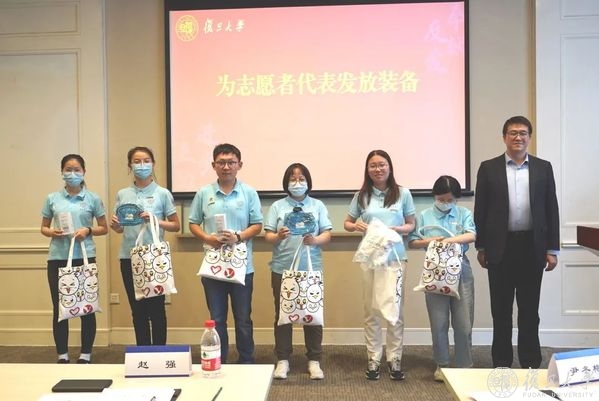 5月18日,“小白鹭”出征仪式在复旦大学光华楼举行,校党委副书记尹冬梅向志愿者授旗,勉励并祝愿志愿者们圆满完成志愿服务工作,平安归来。校团委书记赵强为志愿者代表发放志愿者装备。