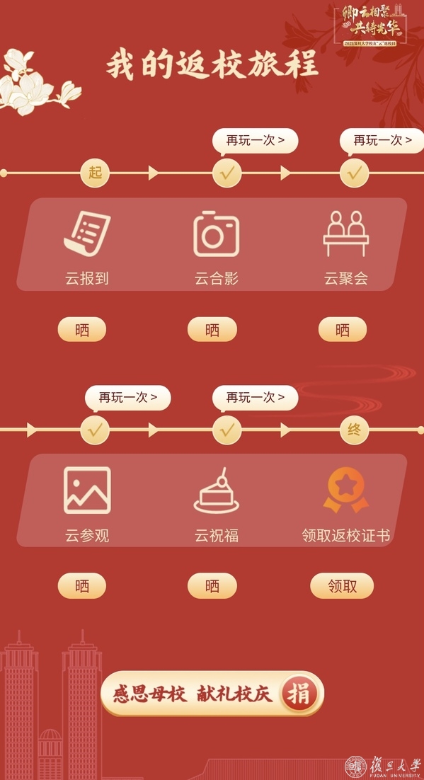 每位校友的“云”返校日之旅设有六大站点,包括“云报道——我回家了,想念你”“云合影——定格卿云,常忆起”“云聚会——久别重逢,老友记”“云参观——母校新程,扬万里”“云祝福——岁月鎏金,常如意”“云捐赠——爱在燕曦,不分离”,呈现了复旦深厚的人文底蕴,表达了校友与母校之间割舍不断的深情。