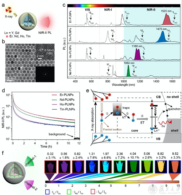 针对以上难题,张凡团队以高能带隙、低声子能的氟化物作为基质材料,利用高温溶剂热分解方法首次设计合成了一系列尺寸、结构和波长可调的近红外第二窗口稀土基长余辉纳米探针(Persistent luminescence nanoparticles, PLNPs)。通过调节发光中心稀土离子的种类,在高能X射线的激发下,得到一系列发射波长位于1000-1700 nm范围的长余辉纳米颗粒。通过优化长余辉纳米颗粒的发光中心离子浓度、基质晶相、颗粒尺寸,以及构建核-壳结构等方法,可使余辉发光时长达到72小时以上。