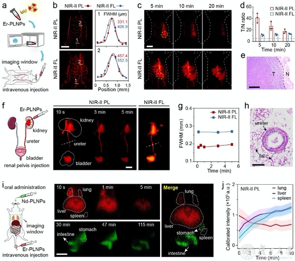 成像指导下的输尿管术中识别(f-h),以及活体脏器多重成像(i-j)。