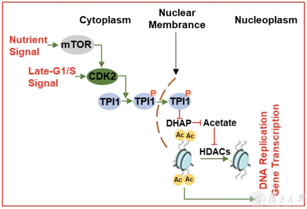 接收了富营养信号的CDK2并不直接进入核内,它通过磷酸化名为磷酸丙糖异构酶 (TPI1) 的糖酵酶并将其引入细胞核。进入核内的TPI1可以通过生成全新的代谢物乙酰DHAP (Acetyl-DHAP)来降低DHAP对组蛋白去乙酰化的促进,进而导致组蛋白乙酰化和基因转录的激活,实现细胞增殖。