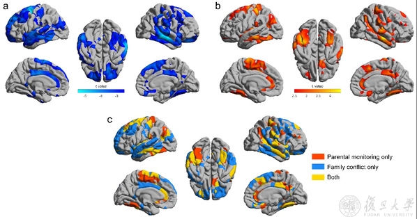 近日,复旦大学类脑智能科学与技术研究院青年研究员程炜和来自英国牛津大学、华威大学等研究人员组成的国际合作团队,首次在大规模人群中揭开了家庭环境(家庭冲突与父母关怀)与儿童脑结构、认知能力和心理健康的相互作用关系。该研究发现,家庭环境与儿童外向行为问题(如冲动行为)显著关联,同时,与大脑眶额叶皮层、颞中回、扣带回以及前额叶等脑区的脑结构指标也密切相关。