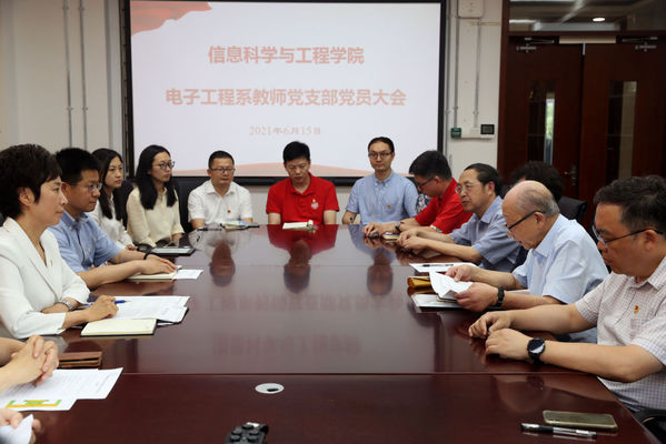 6月15日,在复旦大学信息科学与工程学院电子工程系教师党支部党员大会上,陈振新同志(右二)在宣读自己的入党志愿书。(新华社记者刘颖摄)