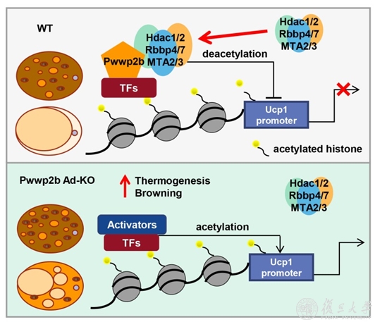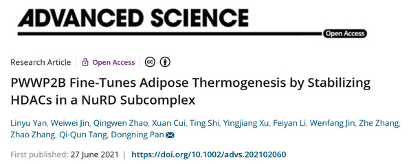 6月27日,复旦大学代谢分子医学教育部重点实验室PI、基础医学院生物化学与分子生物学系研究员潘东宁课题组在Advanced Science杂志上在线发表题为“PWWP2B Fine-Tunes Adipose Thermogenesis by Stabilizing HDACs in a NuRD Subcomplex”的研究论文。该研究利用Adiponectin-Cre驱动的PWWP2B脂肪组织特异性敲除鼠模型及永生化的前棕色脂肪细胞系等,揭示了PWWP2B在棕色/米色脂肪组织中通过招募并稳定组蛋白去乙酰化酶HDAC1/2,负向调控脂肪组织产热功能。