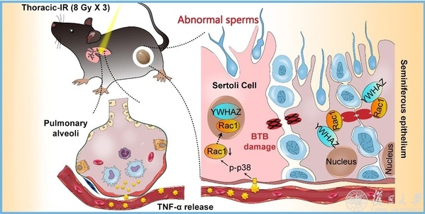 近日,放医所博士研究生胡松玲等人研究发现,雄性小鼠右胸大剂量分割照射后可以引起远端未受照射睾丸组织超微结构的破坏,血睾屏障(blood testis barrier, BTB)紧密连接相关蛋白ZO-1及Occludin完整性丧失;辐射后两周,小鼠精子数量、精子活力及配对雌鼠受孕率显著降低,产生显著的远端生殖损伤效应。机制研究表明,胸部辐照可以释放促炎因子TNF-α,引起远端未受照射睾丸组织中p38发生磷酸化;首次发现睾丸支持细胞(Sertoli cell,SC)极性蛋白YWHAZ可与Rac1蛋白发生共定位,并驱动了Rac1蛋白的核转移,使SC骨架蛋白F-actin和α-tubulin与Rac1发生解离,导致生精小管的极性支撑功能丧失,引起BTB结构的破坏;而照射时给予小鼠TNF-α特异性抑制剂,可以有效降低或消除该辐射远端效应,表明炎性因子TNF-α是诱发辐射远端遗传损伤效应的重要信号因子。这些发现提示我们,胸部放疗对育龄期男性患者存在遗传毒副作用的隐患,放疗前通过适当的药物干预有可能在保证放疗效果的同时最大程度的减少远端生殖系统的损伤,这对提升肿瘤放疗的生物安全性具有重要意义。