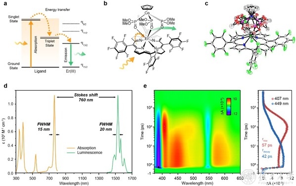 图1:(a)铒-细菌叶绿素配合物的能量传递机理图;(b)铒-细菌叶绿素配合物的代表性分子EB766的化学结构式;(c)EB766的单晶结构;(d)EB766的吸收和发射光谱图;(e)超快瞬态吸收光谱表征EB766的激发态动力学过程。