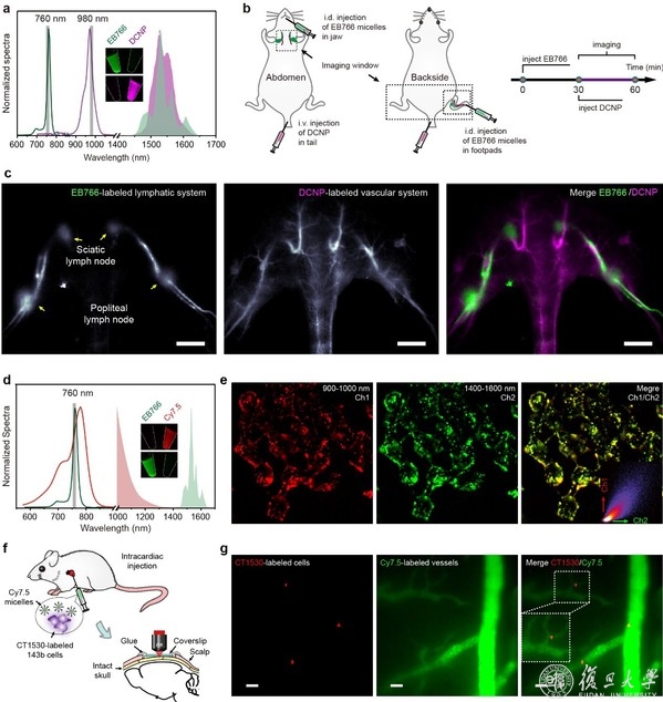 (d-g)基于新型近红外荧光探针构建的发射光谱分离多重成像方案,