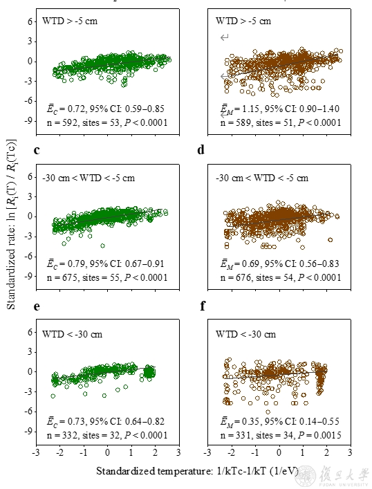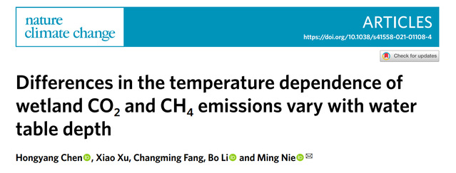 复旦大学生命科学学院生态学科聂明团队的研究发现,在全球尺度上湿地甲烷(CH4)排放的温度敏感性大小主要取决于水位变化,而二氧化碳(CO2)排放的温度敏感性不受水位影响。这一发现为精准预测湿地碳循环与气候变化间的反馈方向及强度提供了重要的科学依据。8月9日,国际气候变化顶级期刊《自然-气候变化》(Nature Climate Change)以研究长文发表了该成果。