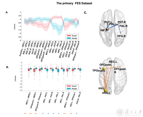 图2. 首发病人被分为两个亚型。A.用于分型的结构共变连接在两组亚型中的Z-score。