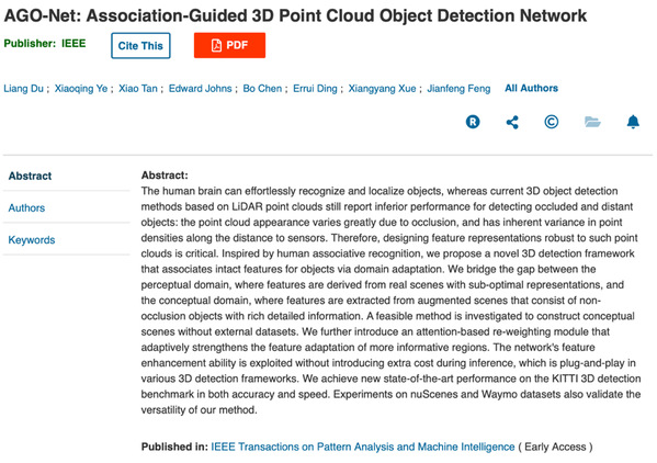 基于激光雷达的三维目标检测技术是机器人和自动驾驶领域最重要的模式识别任务之一。如何针对点云的稀疏性和不规则性设计鲁棒的特征表达,从而提升检测精度,是目前亟待解决的关键难题。复旦大学类脑智能科学与技术研究院冯建峰教授团队联合百度视觉技术团队和南京一汽自动驾驶团队,提出了一种基于人脑联想感知机制的三维目标检测通用框架。8月11日,相关研究成果以《AGO-Net:基于关联引导的三维点云目标检测网络》(“AGO-Net: Association-Guided 3D Point Cloud Object Detection Network”)为题在线发表于全球人工智能领域顶尖期刊《IEEE模式分析与机器智能汇刊》(IEEE Transactions on Pattern Analysis and Machine Intelligence,简称TPAMI)。该成果为自动驾驶三维目标检测技术提供了全新的研究思路。