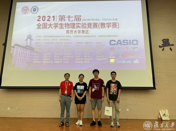 由高等学校国家级实验教学示范中心联席会、全国高等学校实验物理教学研究会、中国物理学会物理教学委员会主办的第七届全国大学生物理实验竞赛(教学赛)于2021年7月20日闭幕。复旦大学物理学系推荐参赛的4位同学都获得一等奖的好成绩,其中二年级本科生娄泽坤和张翊凡在各自的基础实验题中获得第一名,三年级本科生孙雯思和许子轩组队获得综合实验题的一等奖。
