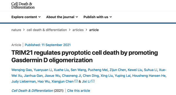 复旦大学生命科学学院李继喜、附属华山医院陈向军团队在炎性细胞死亡的调控机制方面取得重要进展,发现和鉴定到细胞焦亡的新型调控因子TRIM21。9月11日,研究论文以《TRIM21促进Gasdermin D高聚从而调控细胞焦亡》(“TRIM21 regulates pyroptotic cell death by promoting Gasdermin D oligomerization”)为题发表在《细胞死亡与分化》(Cell Death and Differentiation)杂志上。
