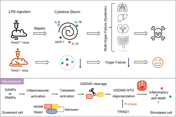 在本研究中,李继喜/陈向军团队通过高灵敏质谱分析,筛选并鉴定到GSDMD的结合蛋白TRIM21,并证明TRIM21与GSDMD在体内外均直接相互作用。TRIM21通过PRY-SPRY结构域结合GSDMD,维持GSDMD在静息细胞中的稳定表达,并在细胞焦亡过程中诱导GSDMD-N高聚。NLRP3或NLRC4炎性小体激活后,TRIM21缺陷型细胞死亡率显著降低;同时在沙门氏菌感染情况下,TRIM21敲除的BMDM细胞也显著提高了存活率。此外,TRIM21敲除小鼠在脂多糖(LPS)诱导的败血症和葡聚糖硫酸钠(DSS)诱导的结肠炎模型中,炎症反应明显减弱,存活率显著提高。这项研究揭示了TRIM21在GSDMD介导的焦亡中发挥重要作用,为控制和治疗炎症相关疾病提供了全新作用靶标。