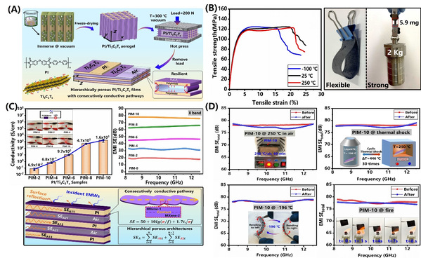 (A)设计与制备过程,(B)力学性能,(C)常温下电磁屏蔽性能与机理(D)恶劣条件下电磁屏蔽性能。