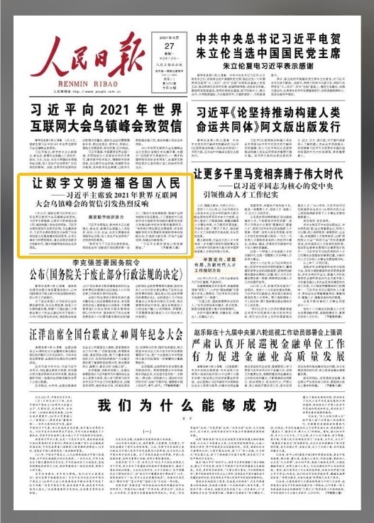 2021年世界互联网大会乌镇峰会9月26日在浙江乌镇开幕,本次峰会旨在展示国内外优秀的互联网技术、产品和应用成果,促进交流合作。国家主席习近平向峰会致贺信,习近平主席强调,让数字文明造福各国人民,推动构建人类命运共同体。