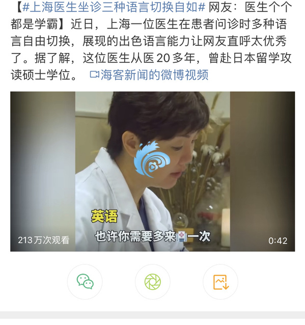 上海医生日语、英语、上海话三种语言切换自如,出色语言表达能力在社交媒体“出圈”。