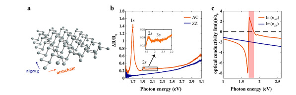图1:a.单层黑磷的原子结构,源于这种褶皱的晶格结构,黑磷沿两个晶向具有不同的光学响应;b.实验的光学反射谱,除了激子的基态(1s),更高的激发态(2s、3s也被观测到了);c.拟合得到的光学电导率,图中阴影部分为双曲激子极化激元模式存在的光谱范围((Im(σAC)⋅Im(σZZ)<0));