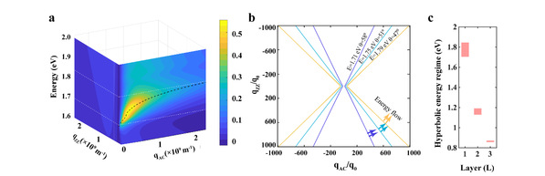 图2:a.不同晶向上的损耗函数分布的伪彩图;b.双曲区间不同能量处(E=1.71 eV, 1.75 eV, 1.79 eV)极化激元的等能线,为开放的双曲形状,传播方向为双箭头所示方向;c.双曲区间随层数的变化,随着层数的增大,双曲区间变窄,光谱范围由可见延伸到红外区域。