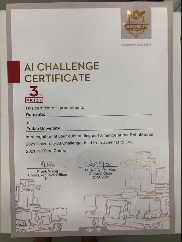 复旦大学机器人校队获奖证书