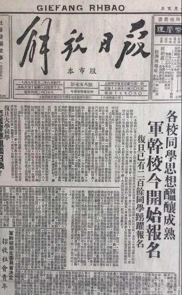 《解放日报》195175日头版刊登“军干校今开始报名,复旦已有二百余位同学踊跃报名”