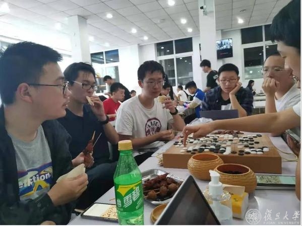 如果不是协会骨干张力恒告诉我们,大家也许很难会想到围绕着仙风道骨的棋盘对决的,有时竟是最接地气的烧烤和汽水。去年由于疫情,南娱场地不开门,新生杯被棋社巧妙地安排在了复旦北区食堂和南区春晖餐厅,你来我往、试探交锋的棋局之上,点缀着队友、对手之间的觥筹交错。一手拿着棋子,一手握着春晖食堂的烧烤,这幅颇具生趣的画面反映出棋社独特的亲和力和生命力。