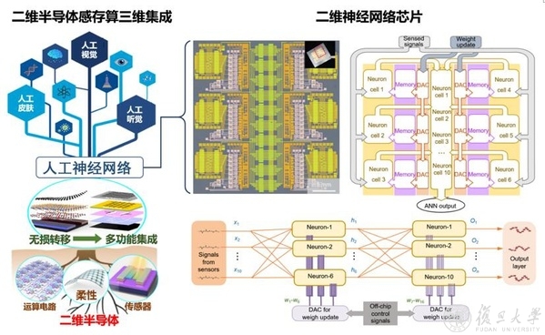 通过算法优化后的晶圆级二维半导体工艺,可以得到兼容性强的增强型顶栅晶体管,并基于此工艺成功演示了各种数字、模拟、存储、光电探测等集成电路单元(图2)。进一步,研究团队充分利用二维半导体超薄厚度、可调带隙等优势,构建了包含突触权重存储单元、乘加卷积运算单元以及激活函数单元的全二维人工神经网络芯片(图3),“一站式”地突破了二维半导体从器件工艺到芯片制造的困难。10月5日,工作进展以《基于二维半导体的人工神经网络芯片》(“An Artificial Neutral Network Chip Based on Two-Dimensional Semiconductor”)为题发表于国内期刊《科学通报》(Science Bulletin)。学院青年副研究员马顺利,博士生吴天祥、陈新宇为本文的共同第一作者;包文中研究员、任俊彦教授和周鹏教授为该工作的共同通讯作者。