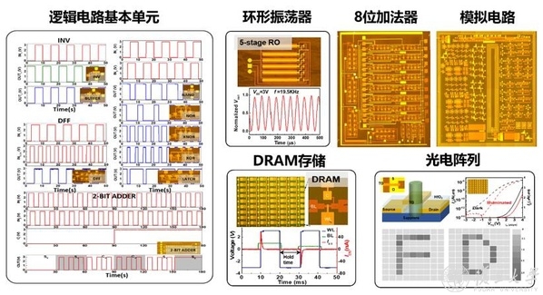 图2. 利用优化的二维半导体顶栅工艺制作的各种常见集成电路单元