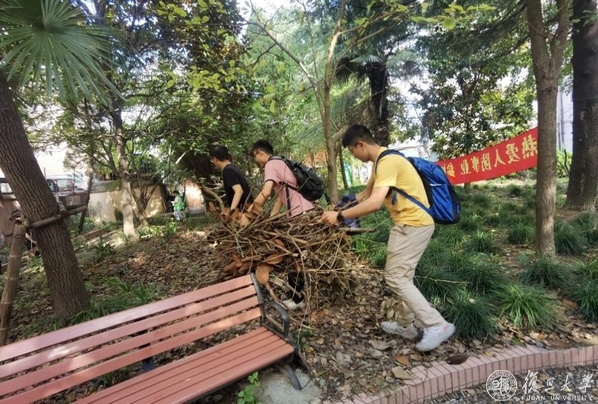 第六小组成员帮助整理凤城六村一号大楼绿化带