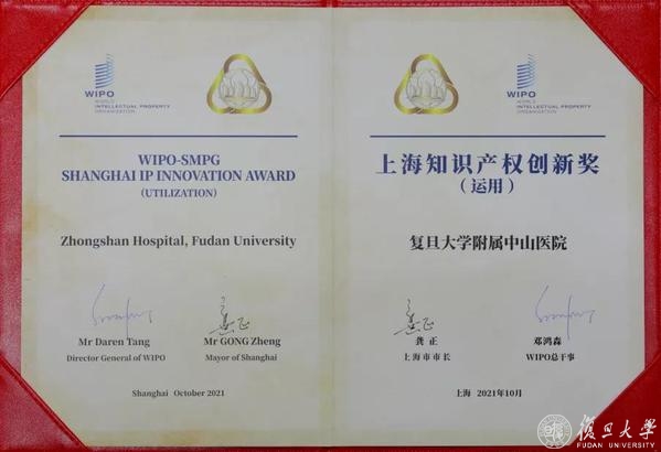 10月19日举办的第十八届上海知识产权,国际论坛上,中山医院荣获第三届上海知识产权创新奖“运用奖”。
