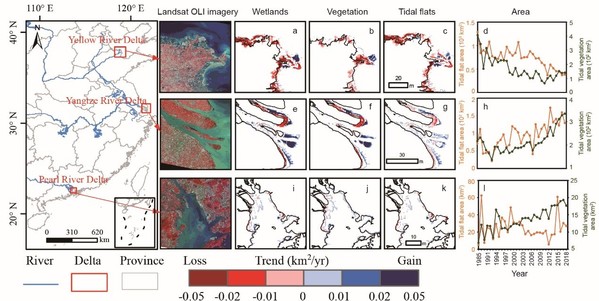 该文利用长时间序列Landsat遥感影像、云计算平台以及基于像元—物候的滨海湿地监测算法,获得了1984-2018年间中国逐年滨海湿地(光滩、盐沼和红树林)分布数据,并从不同空间尺度(国家、省级、河口和像素尺度)系统分析了中国滨海湿地的分布动态及其驱动力。研究发现,中国东部三大河口中,黄河口滨海湿地面积显著下降,但盐沼面积2012年以后缓慢恢复;长江口区上海市的滨海湿地面积整体显著上升;珠江口光滩面积波动较大,湿地植被面积在逐年稳步恢复。