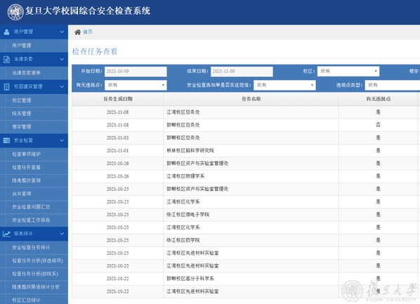 设施设备建设方面,通过教育部专项和学校经费对学校重点区域的消防系统进行了完善升级,基本实现了消防报警系统全覆盖,提升了校园消防安全等级。开发了复旦大学消防安全检查信息系统,实现安全检查无纸化,实时反馈和整改进度的有效跟进,提升了消防的智能化水平。